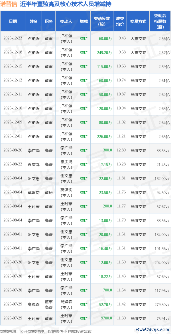 证券之星音信,证实12月24日市集公开信息、上市公司公告及来往所涌现数据整理,诺普信(002215)最新董监高及关系东说念主员股份变动情况:2025年12月23日公司董事卢柏强共减抓公司股份60.0万股,占公司总股本为0.0597%。变动时间公司股价着落1.53%,12月23日当日收盘报10.31元。